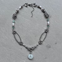 A simple yet intricate everyday wear necklace made with donut jade, freshwater pearls and stainless steel findings.