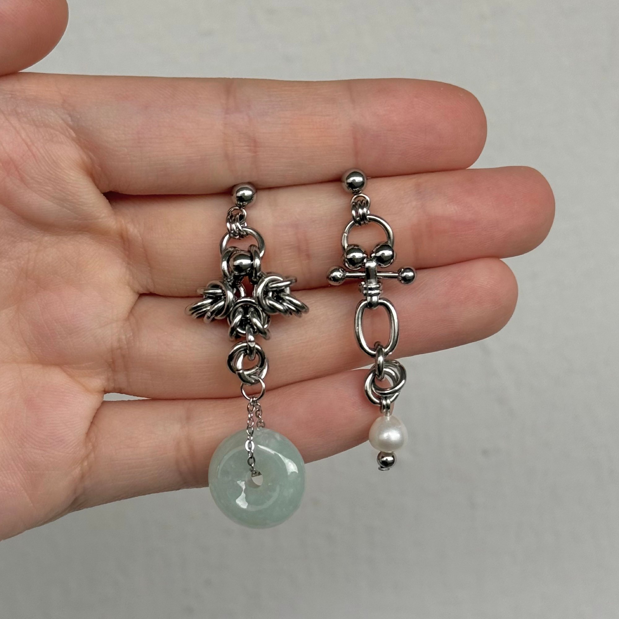 An asymmetrical donut jade earring is just what you need! Stainless steel and adorned with freshwater pearl, this perfect balance of utility and elegance is a necessity for your everyday wear.