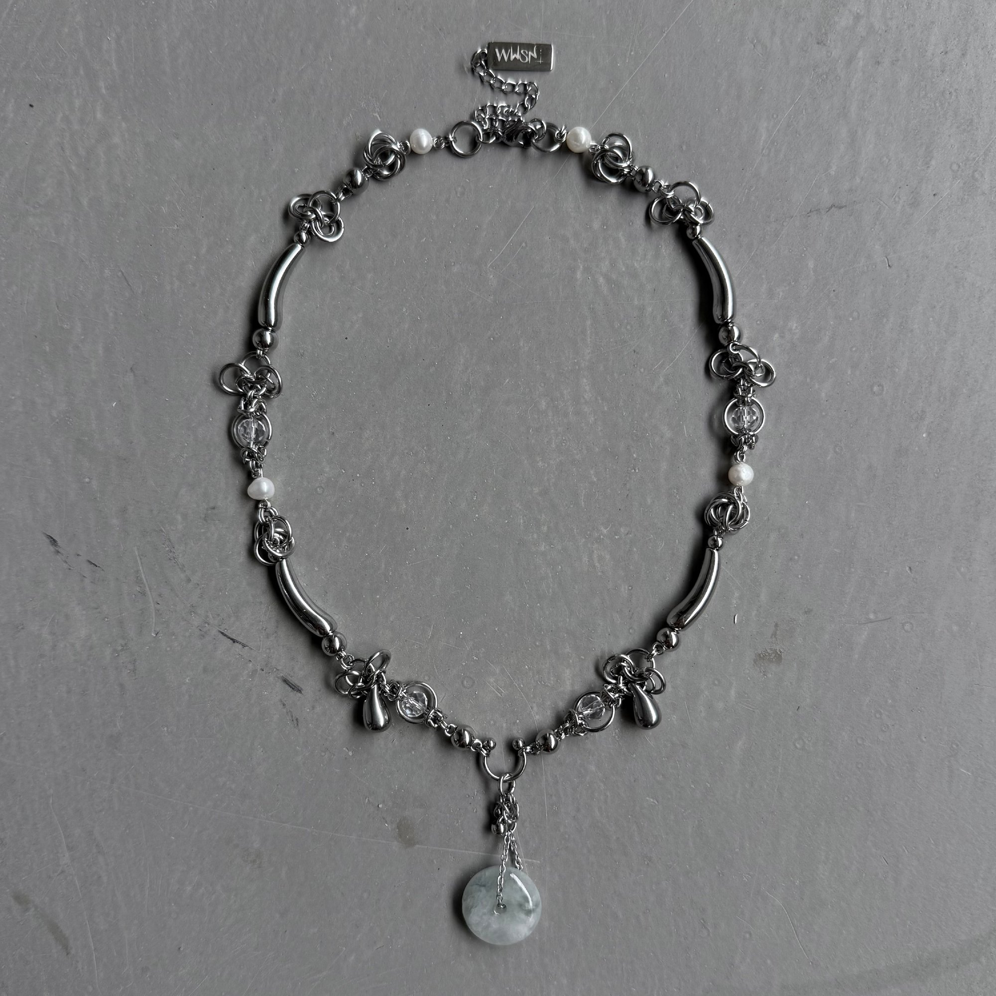 Elevate your everyday-wear style with this donut jade piece made with stainless steel lucky-knot chainmaille pattern, freshwater pearls and crystals.